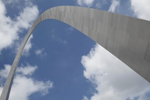 This photograph captures the soaring curve of a monumental arch, elegantly stretching upwards against a backdrop of vibrant blue sky and fluffy white clouds. The polished metallic surface glistens in the sunlight, creating a sense of both aspiration and grandeur, as the viewer is drawn to the arch's captivating form. The composition emphasizes the monument's height and elegance, evoking feelings of wonder and ambition.