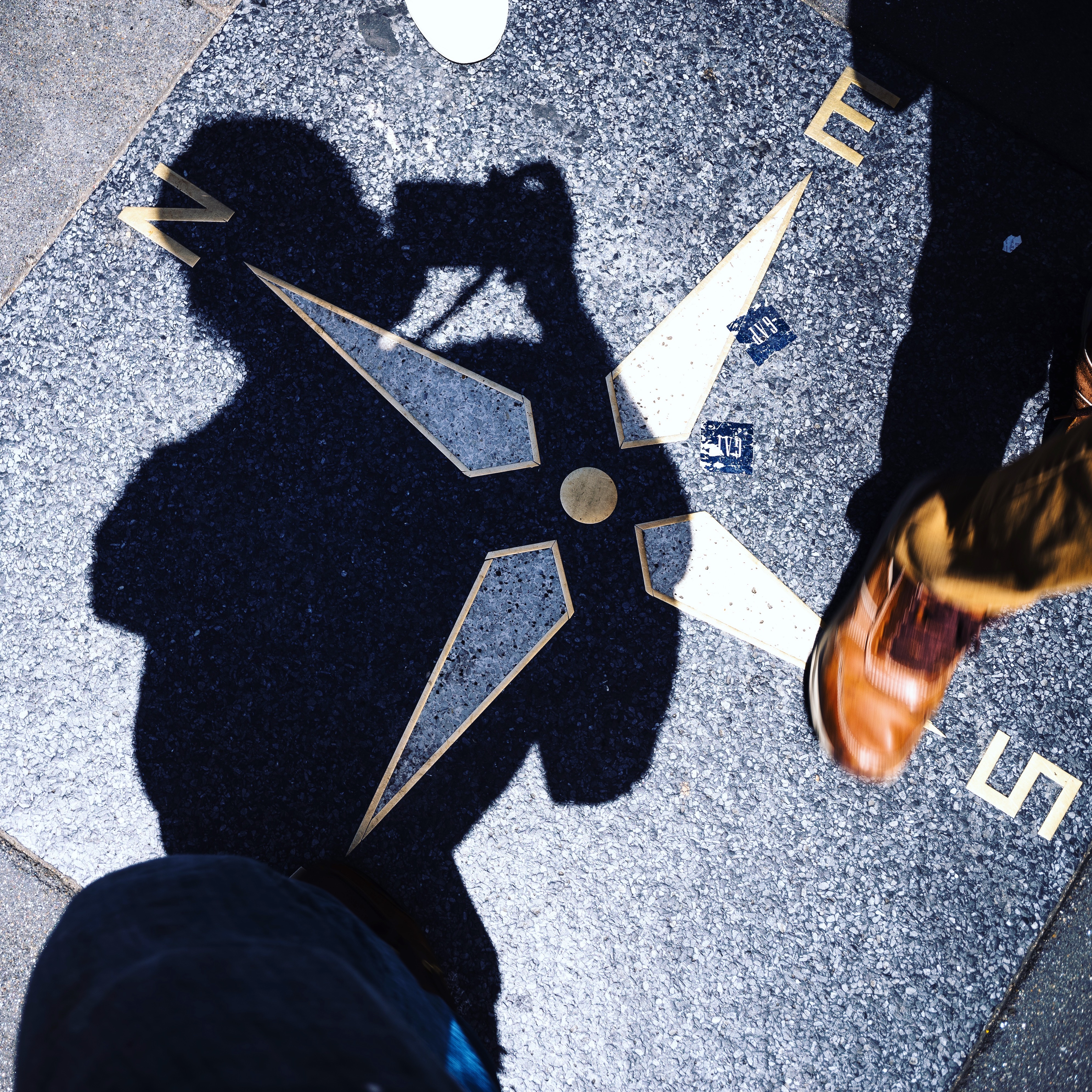 This photograph captures the shadows of passersby and a compass design etched into the pavement, beautifully emphasizing urban movement. The interplay of light and shadow creates a dynamic mood, suggesting a moment of exploration and discovery. Warm light illuminates the scene, drawing attention to the intricate details of the compass amidst the bustling surroundings.