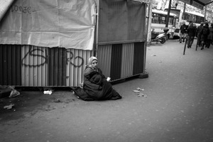 In this stark black and white photograph, a woman sits against a cold, metal barrier, wrapped in a dark blanket, conveying a sense of solitude and vulnerability. Her gaze reflects a deep emotional weight amidst the hustle of passersby, creating a poignant contrast between her stillness and the movement around her. The subdued lighting enhances the mood, emphasizing the harsh realities of her situation while inviting empathy from the viewer.