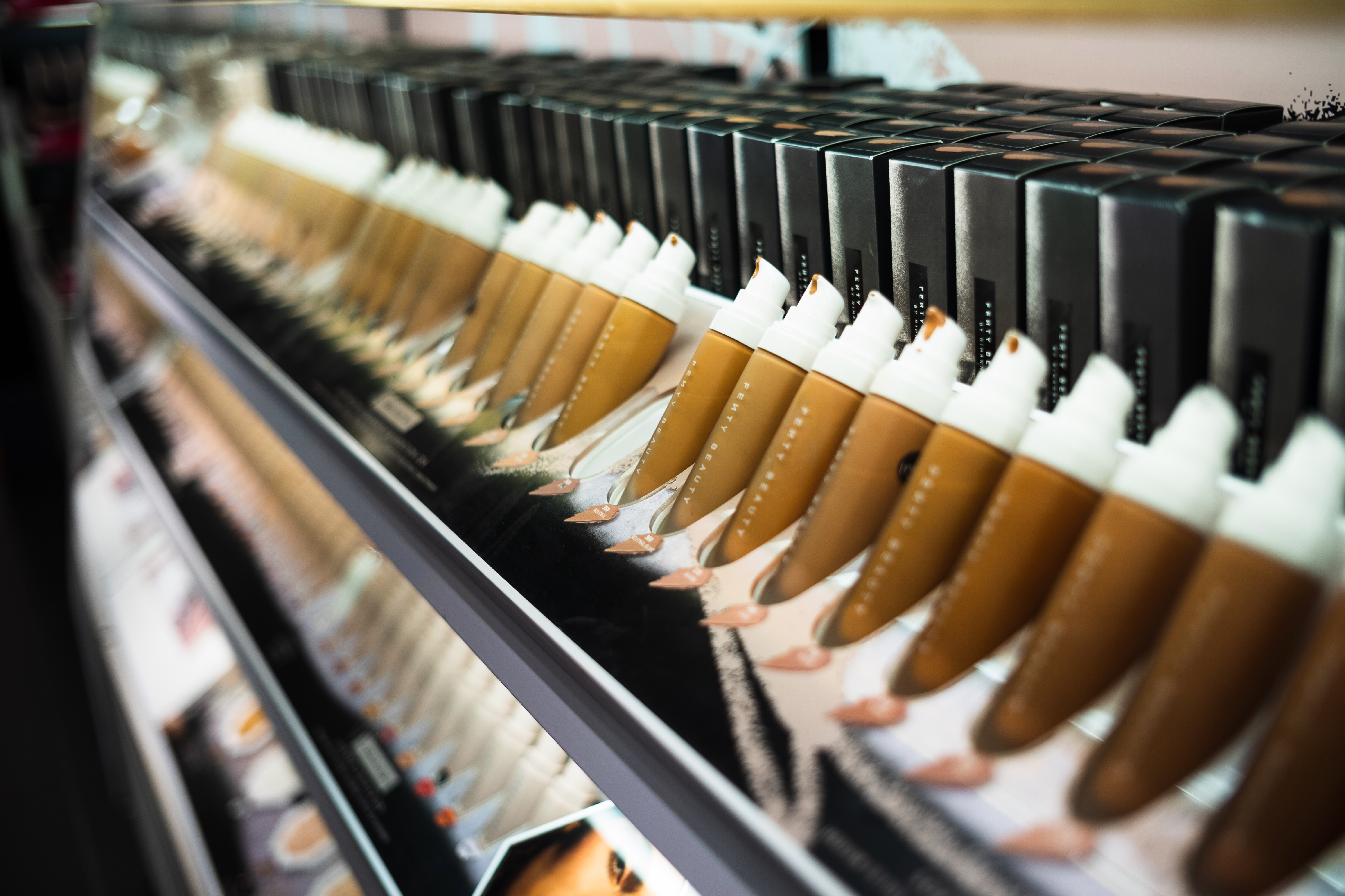 This photograph captures a meticulously arranged display of foundation bottles, emphasizing a diverse range of earthy tones. The soft, reflective lighting creates an inviting atmosphere, highlighting the smooth textures of the products. The slight tilt of the composition draws the viewer’s eye along the spectrum, evoking a sense of harmony in choices for beauty.