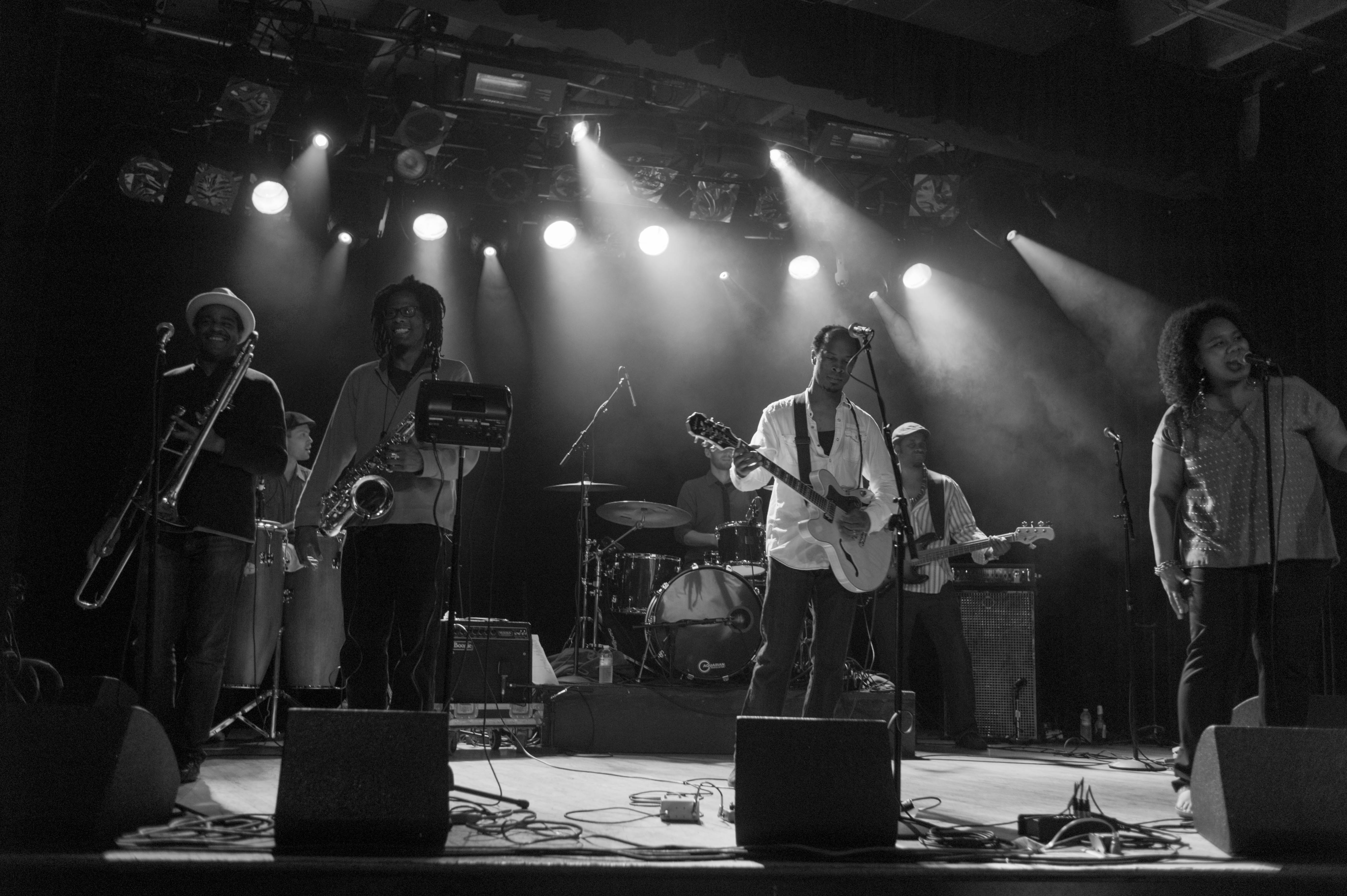 A vibrant black-and-white scene captures a passionate performance on stage, highlighting a diverse group of musicians immersed in their craft. The dynamic interplay of light, with beams cascading down, creates a dramatic atmosphere, enhancing the energy radiating from the performers. The composition draws the viewer's eye from the foreground musicians to the distant drummer, suggesting a feeling of unity and rhythm that resonates throughout the venue.