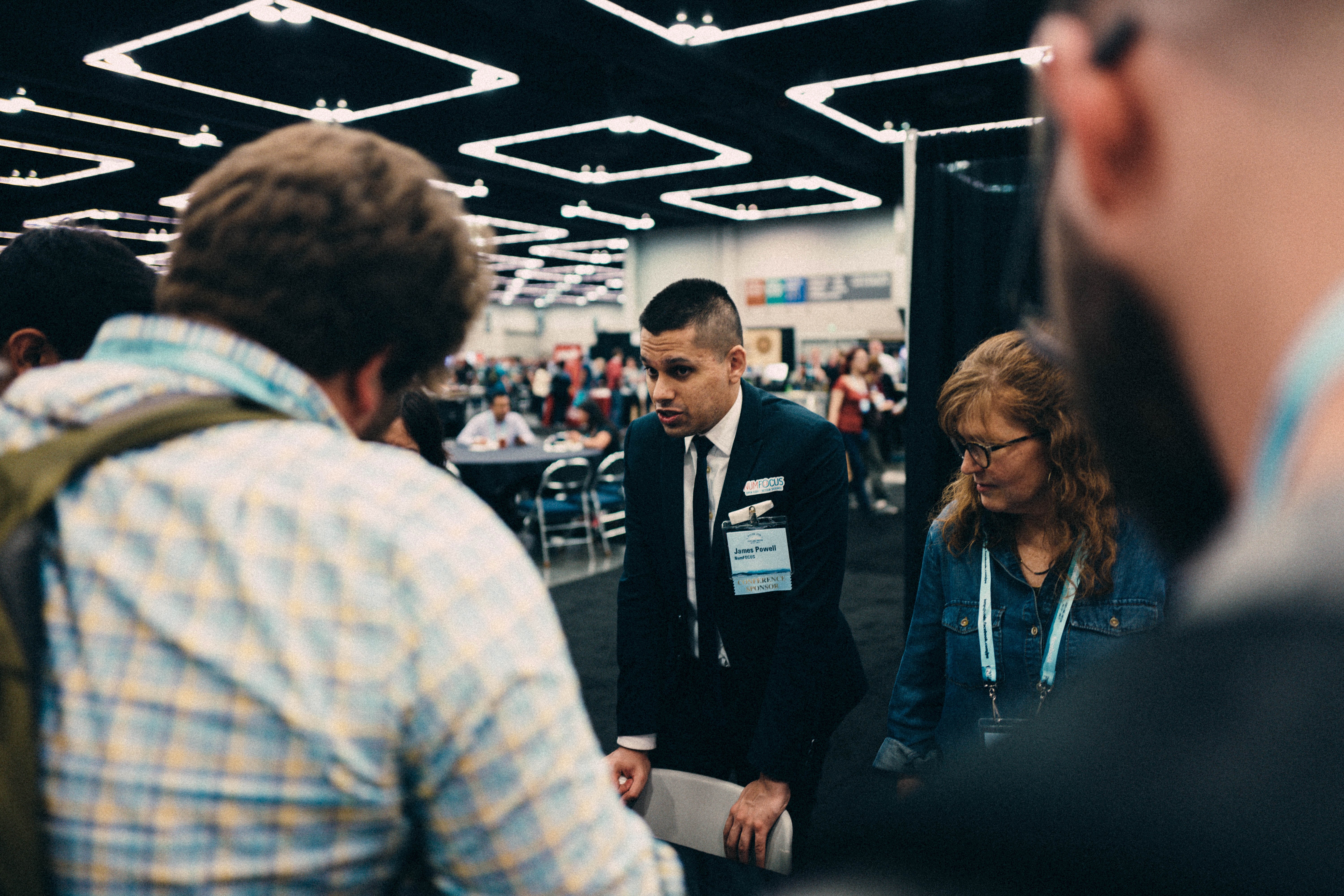 In this bustling conference scene, a well-dressed man in a suit interacts earnestly with a small group surrounding him. The dim lighting contrasts with the bright overhead fixtures, creating a focused yet dynamic atmosphere, as attendees engage deeply in conversation amidst the vibrant background of people and booths. The mood is one of collaboration and professional curiosity, highlighting the energy of collective ideas.