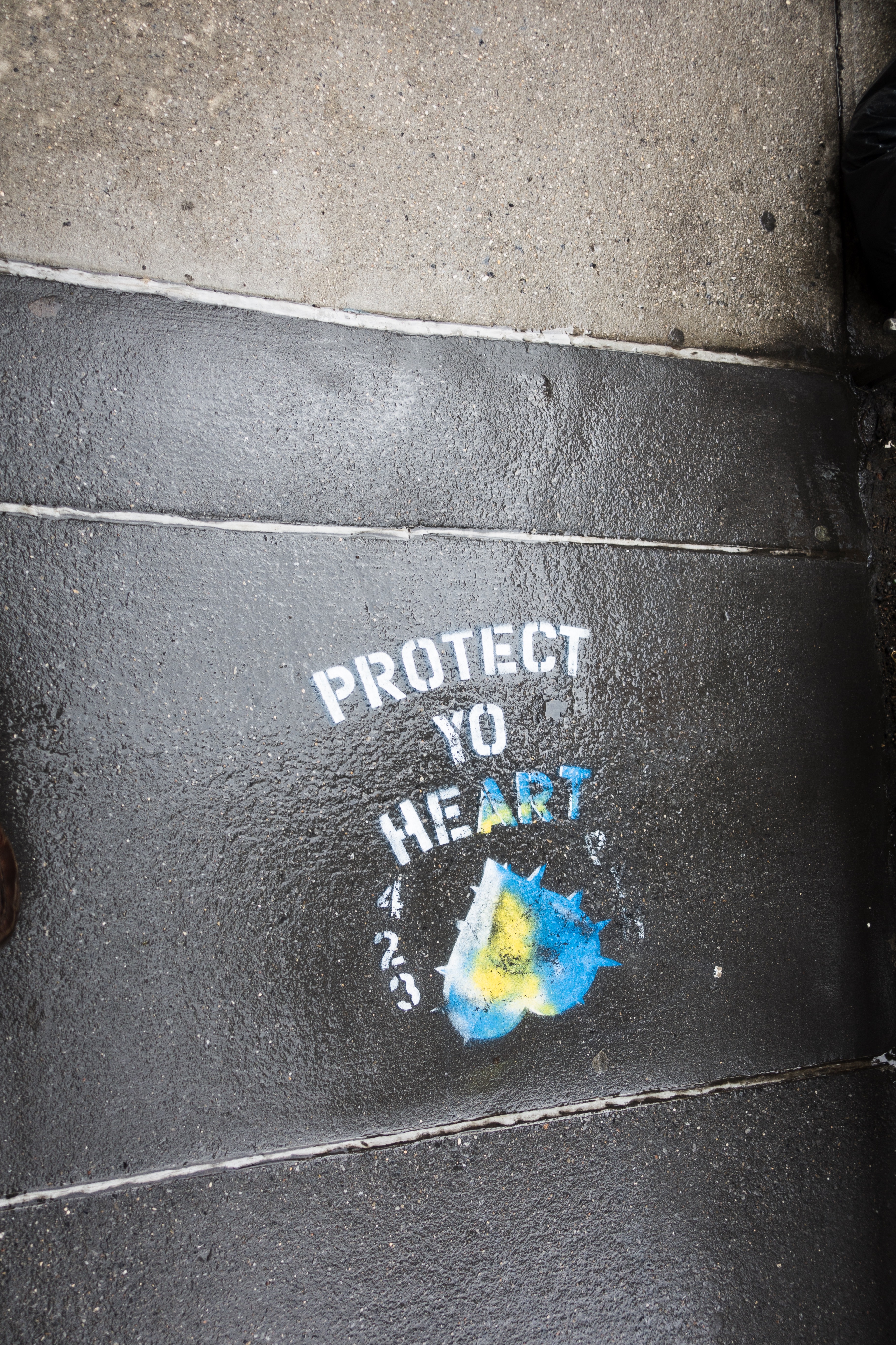 This photograph captures a poignant street art piece painted directly onto wet pavement, reading 'PROTECT YO HEART'. The vibrant blue and yellow colors stand out against the dark, glossy surface, evoking a sense of urgency and hope amidst an urban setting. The moody lighting and rain-slick surface enhance the emotional weight of the message, encouraging passersby to reflect on self-care and vulnerability.