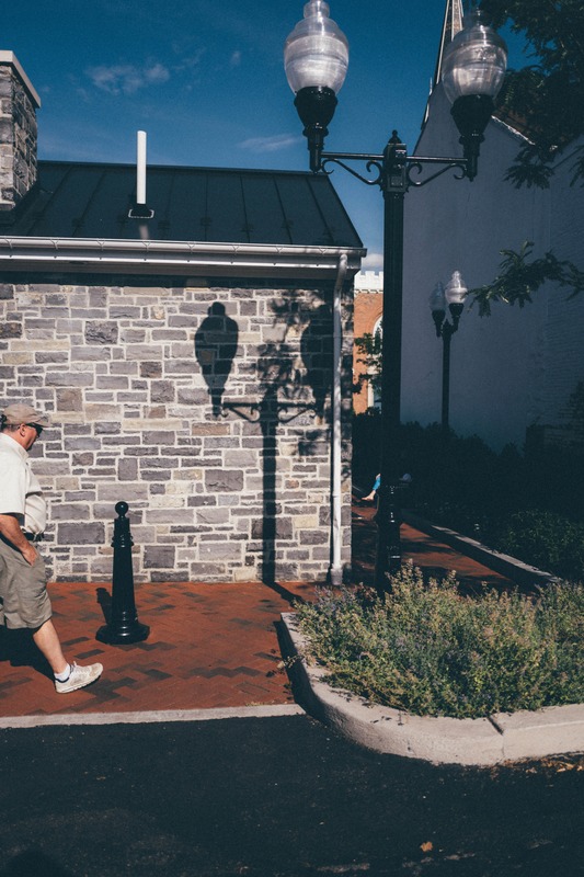 In this photograph, a man casually walks past a textured stone wall, casting elongated shadows that dance with the warm afternoon light. The interplay between the man and the shadowy streetlamps creates a contemplative mood, highlighting themes of solitude and urban life. Hints of greenery in the foreground contrast with the structured environment, adding a touch of nature to the scene.