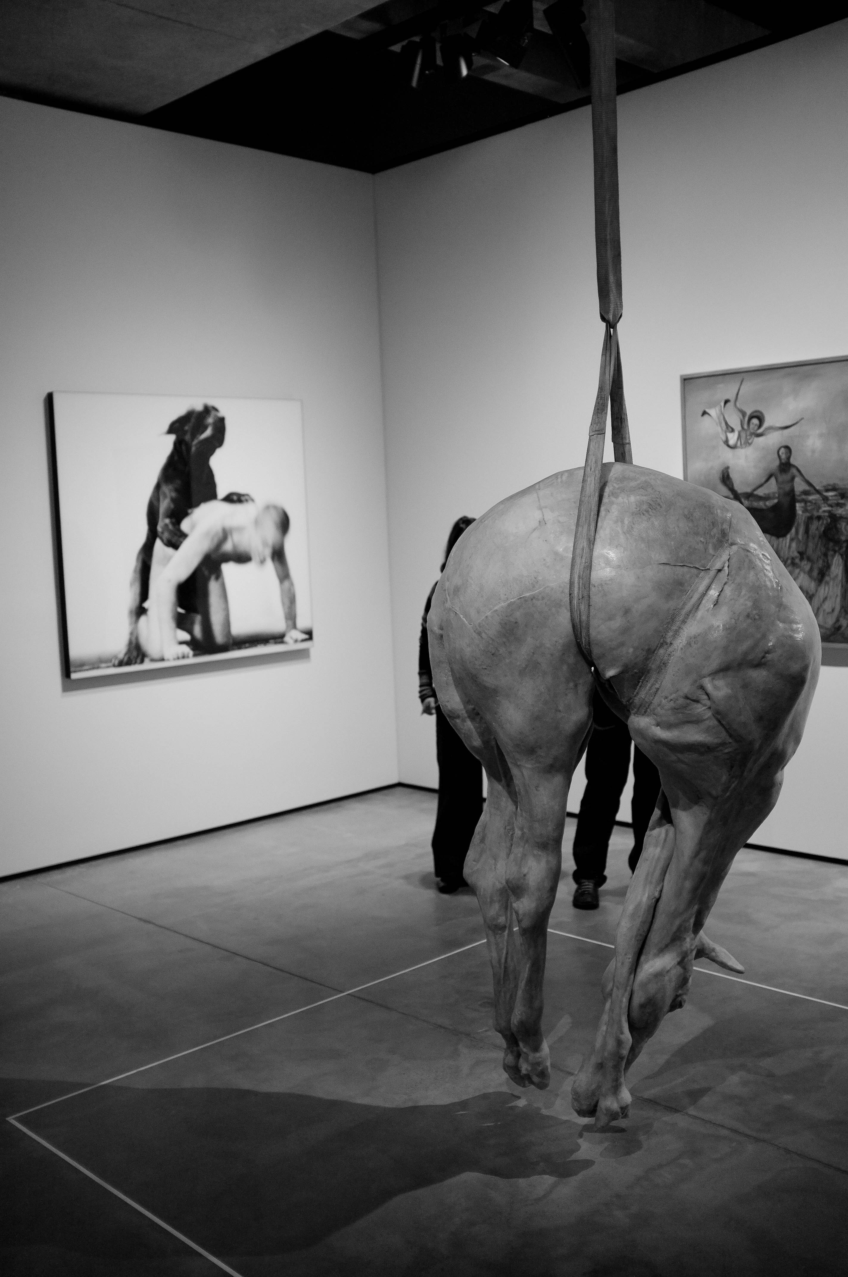 This striking photograph captures a sculptural piece suspended in an art exhibit, drawing the viewer's eyes toward its uncanny realism. Dark shadows and stark light emphasize the form's textures, while figures in the background engage with other artworks, creating a juxtaposition between the rawness of the sculpture and the human experience. The monochrome palette lends a somber yet thought-provoking mood, inviting reflection on the themes of vulnerability and the human condition.