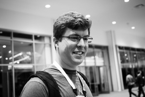 The photograph captures a man in casual attire, smiling softly amidst a blurred background of modern architecture. His glasses and relaxed demeanor give an impression of approachability, while the monochrome palette adds a nostalgic and contemplative mood. The lighting subtly highlights his features, emphasizing a moment of connection in a bustling environment.