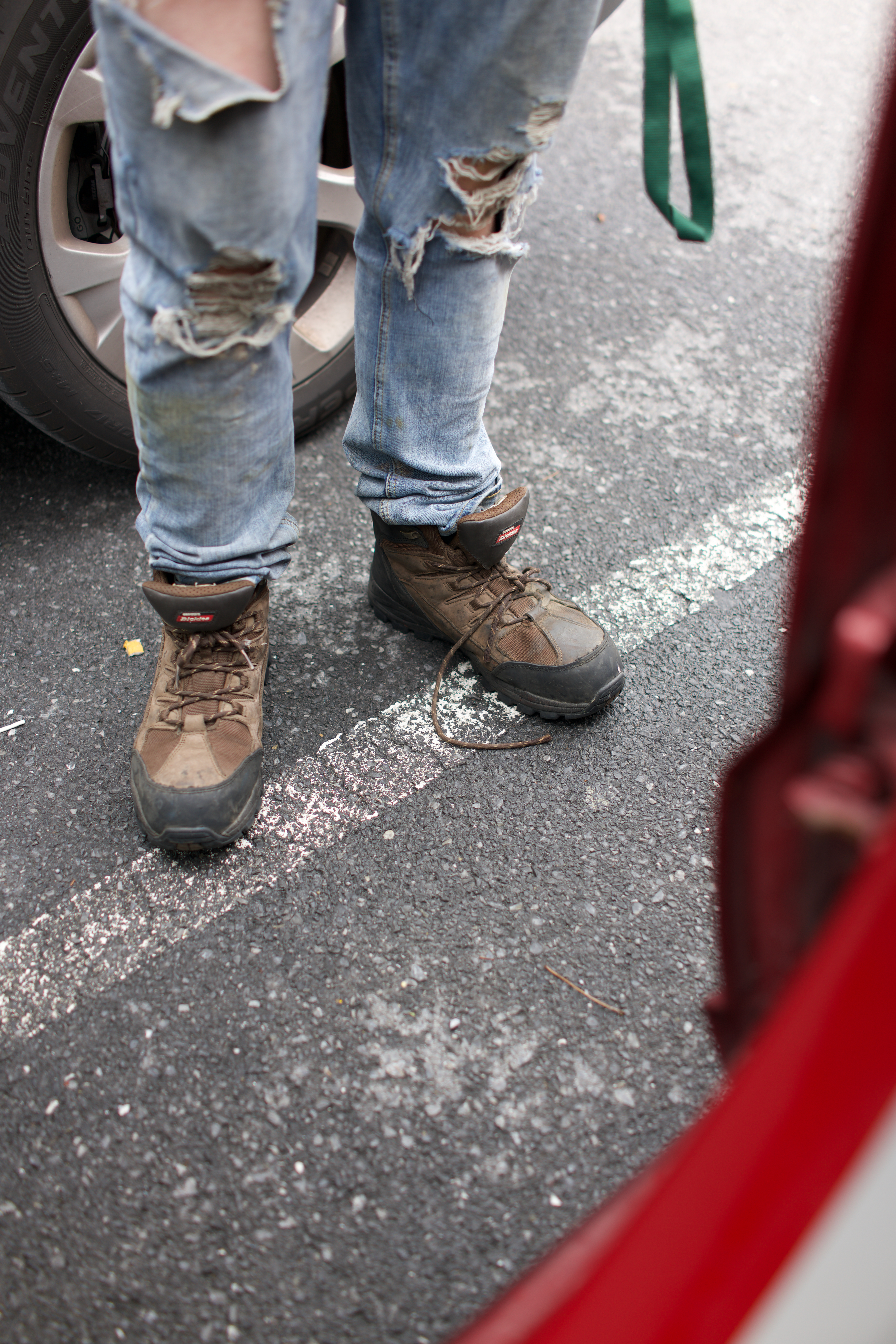 The photograph focuses on a pair of rugged boots standing on a cracked parking lot surface, embodying a sense of adventure and readiness. Torn jeans add a layer of grit, contrasting with the subtle brightness of the surrounding light. Framed by the car door, the composition invites a glimpse into an outdoor journey, hinting at stories waiting to unfold.