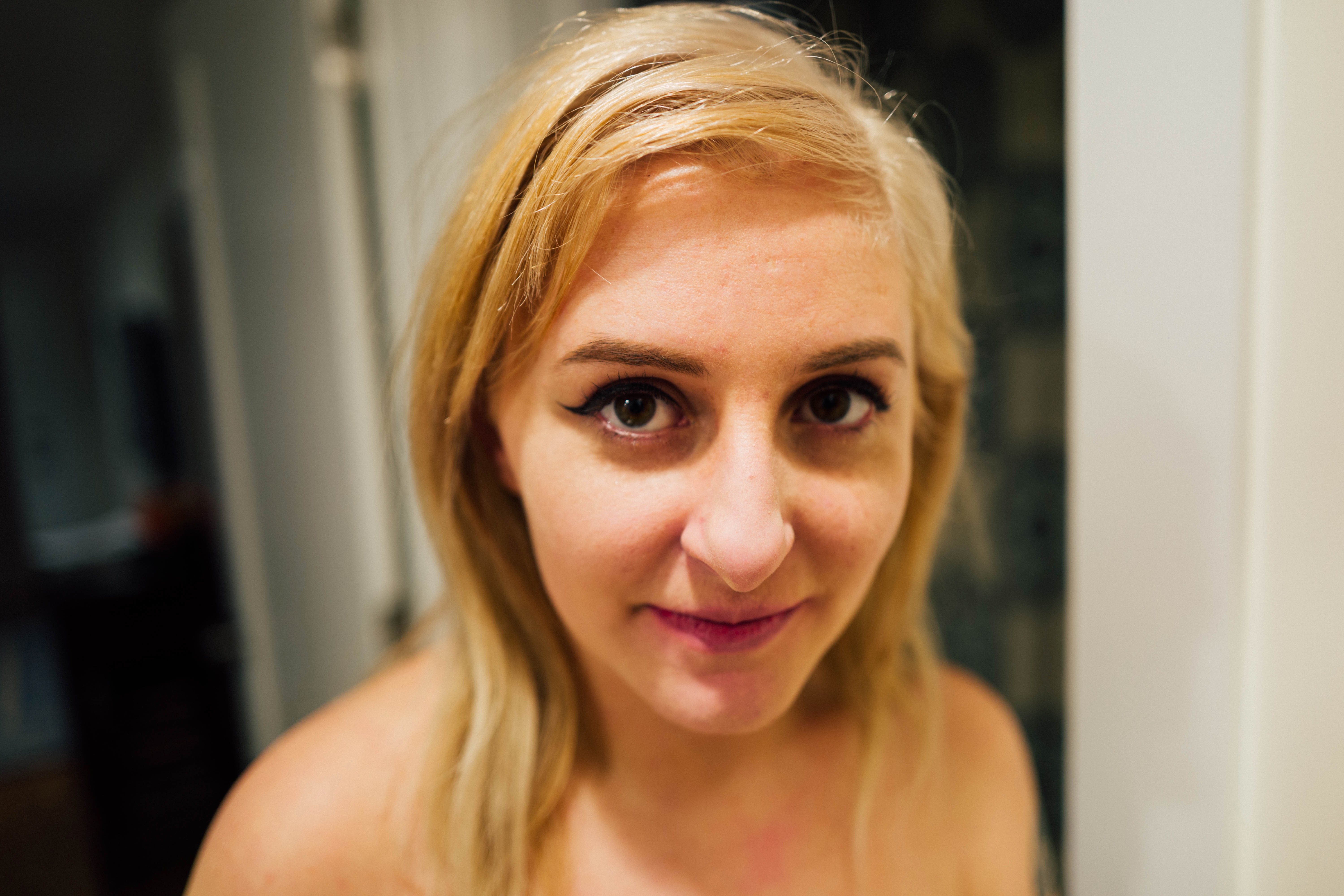 This close-up portrait captures a young woman with blonde hair and striking eyes, exuding a sense of warmth and curiosity. The soft, natural lighting enhances her features and creates a serene atmosphere, while the blurred background suggests a personal space. The composition draws the viewer's focus toward her expressive face, evoking a feeling of connection and intrigue.