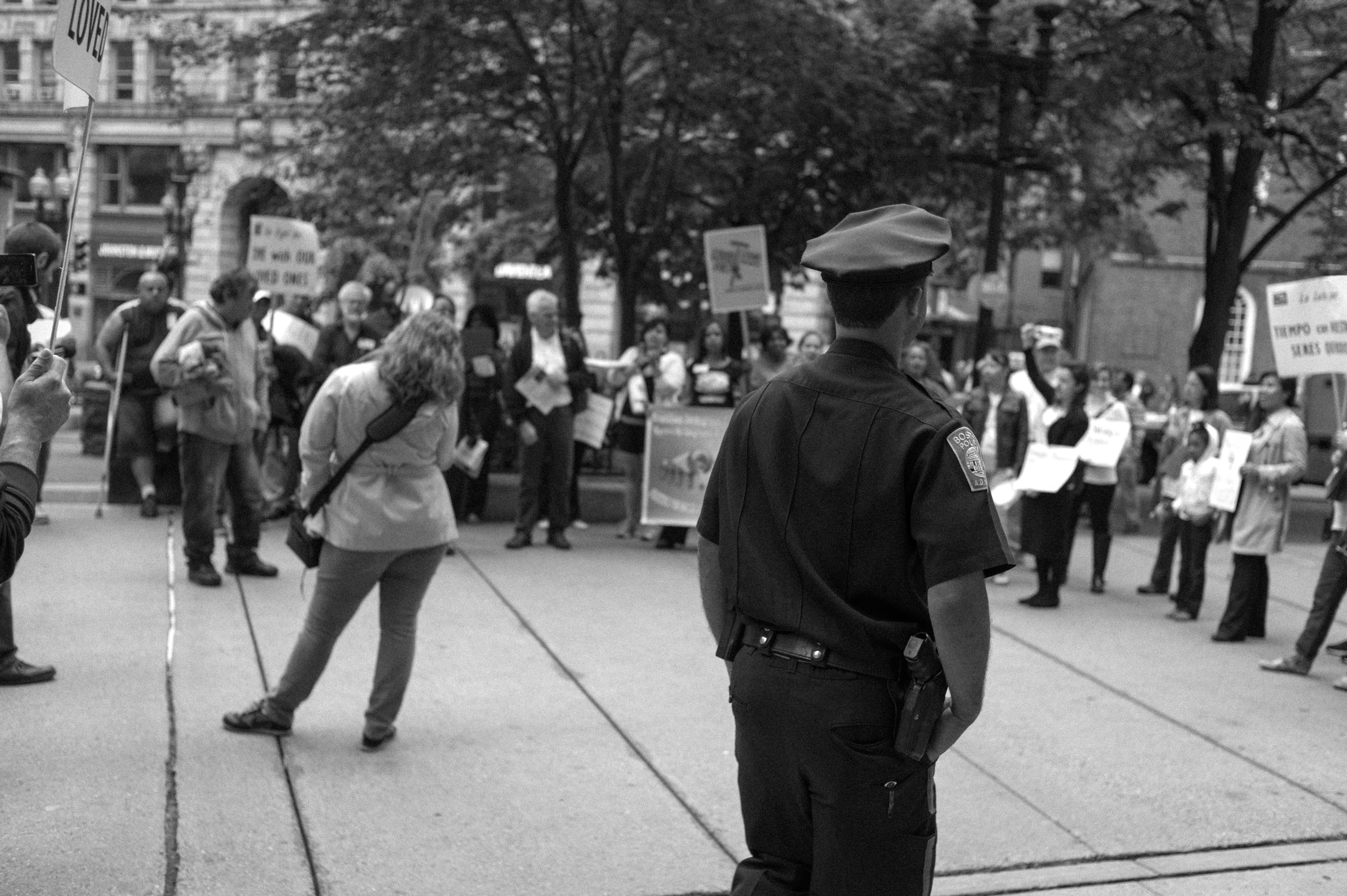 In a black-and-white scene, a police officer stands with his back turned, observing a crowd of passionate protesters holding signs. The mood is charged, reflecting a mix of defiance and authority as the trees and buildings loom in the background, hinting at the urban setting. The narrow focus on the officer, contrasted with the crowd’s expressive gestures, underscores the dynamic between order and unrest.