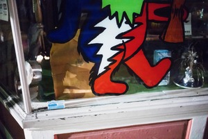 The photograph captures a close-up of a storefront window adorned with colorful, abstract figures, primarily in bold reds, blues, and greens. The mood is playful yet slightly mysterious, with dim lighting emphasizing the vibrancy of the artwork against the muted backdrop of the shop's interior. Reflections and illuminated objects partially visible behind the glass add depth, creating an intriguing interplay between the outside world and the lively colors within.
