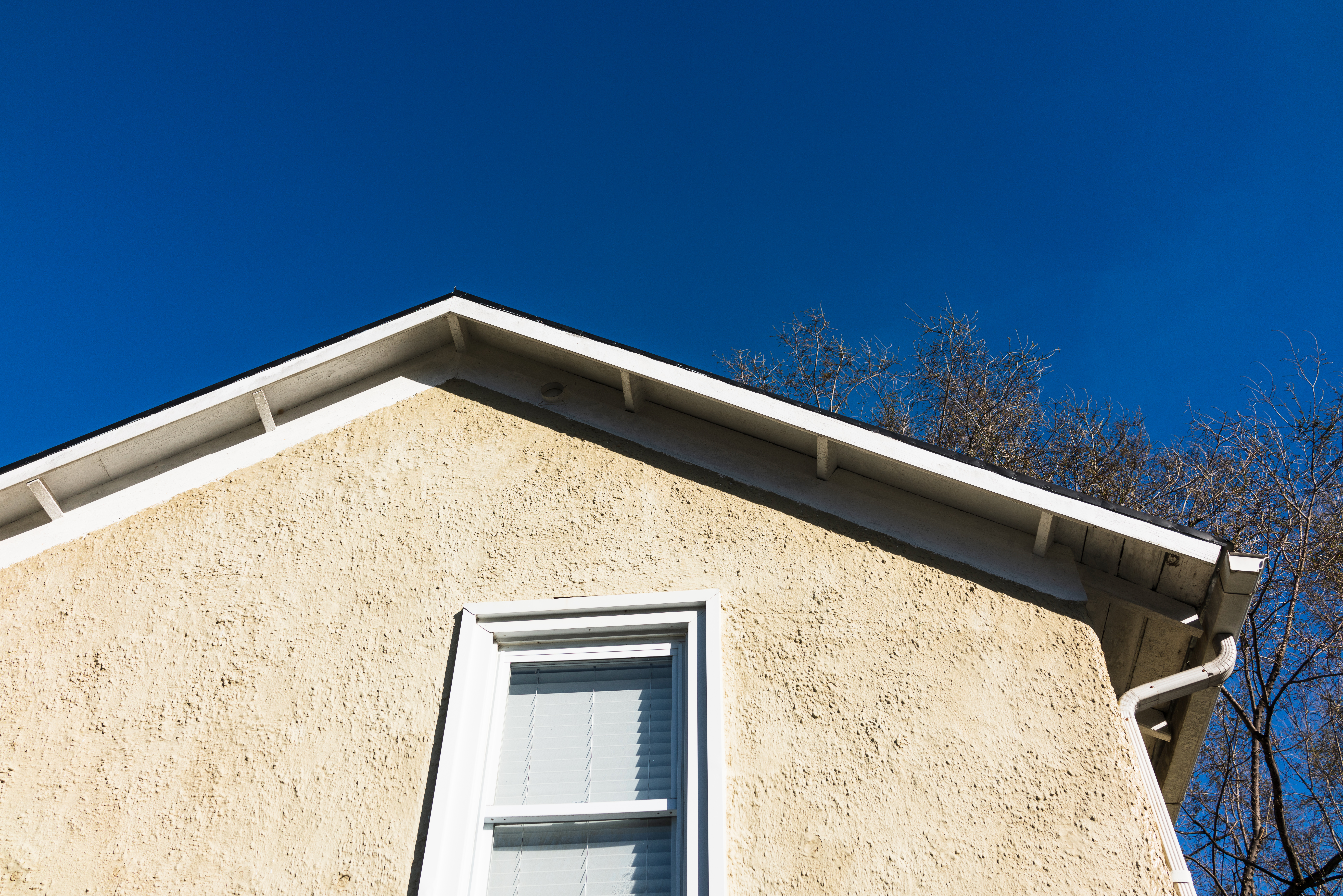 The photograph captures the corner of a modest house against an expansive blue sky, evoking a sense of tranquil solitude. The warm beige of the textured wall contrasts beautifully with the vibrant blue above, creating a mood of calm and simplicity. With the composition focused on the architectural lines and angles, it highlights the charm of everyday life in a moment of stillness.