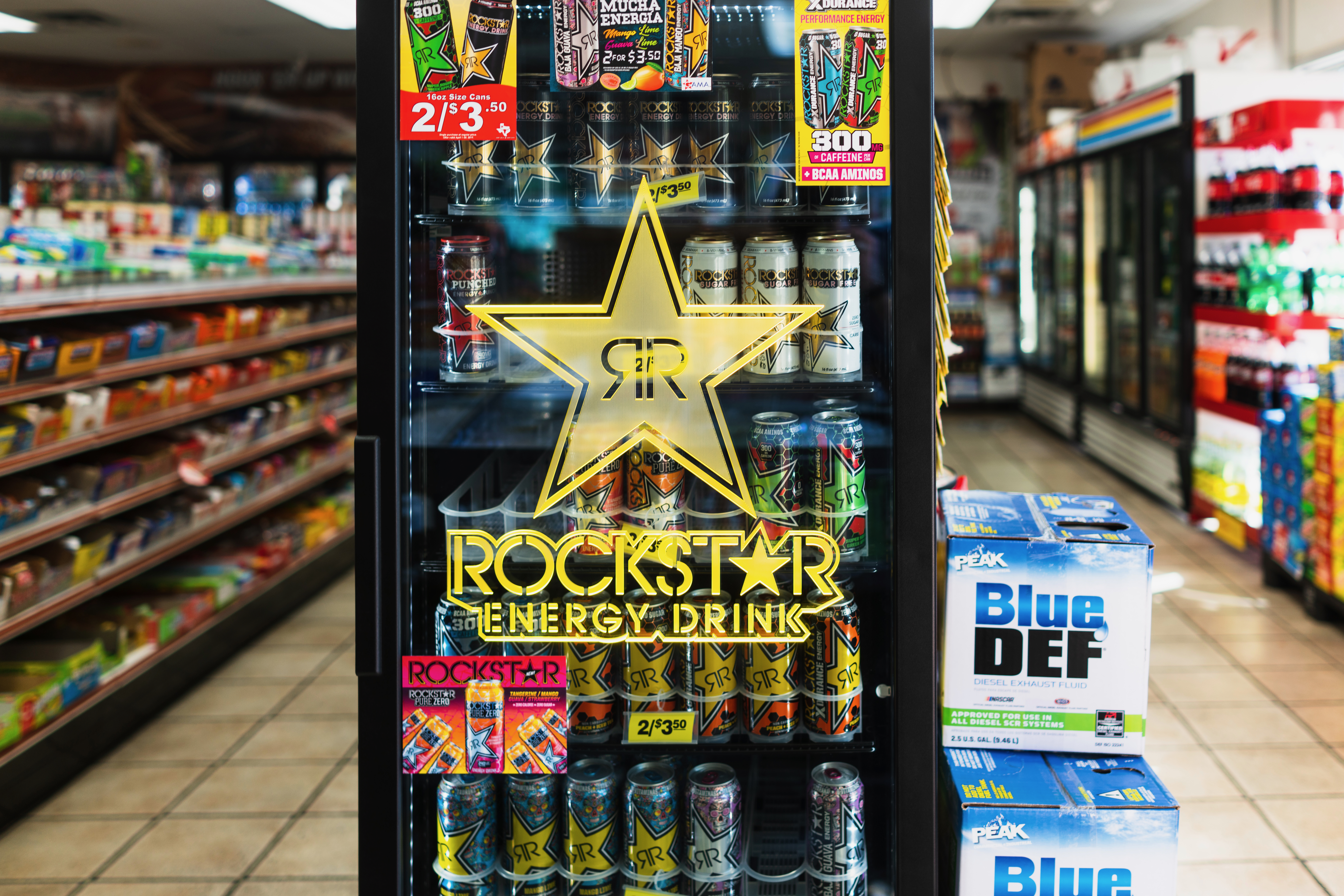 The photograph captures a brightly lit vending display of Rockstar Energy Drink, showcasing a bold star logo and colorful cans. The composition emphasizes the vibrant hues against the backdrop of a convenience store, creating a lively and energetic atmosphere. The clear glass and focused lighting draw the viewer's eye, inviting a sense of urgency and excitement about the products on offer.