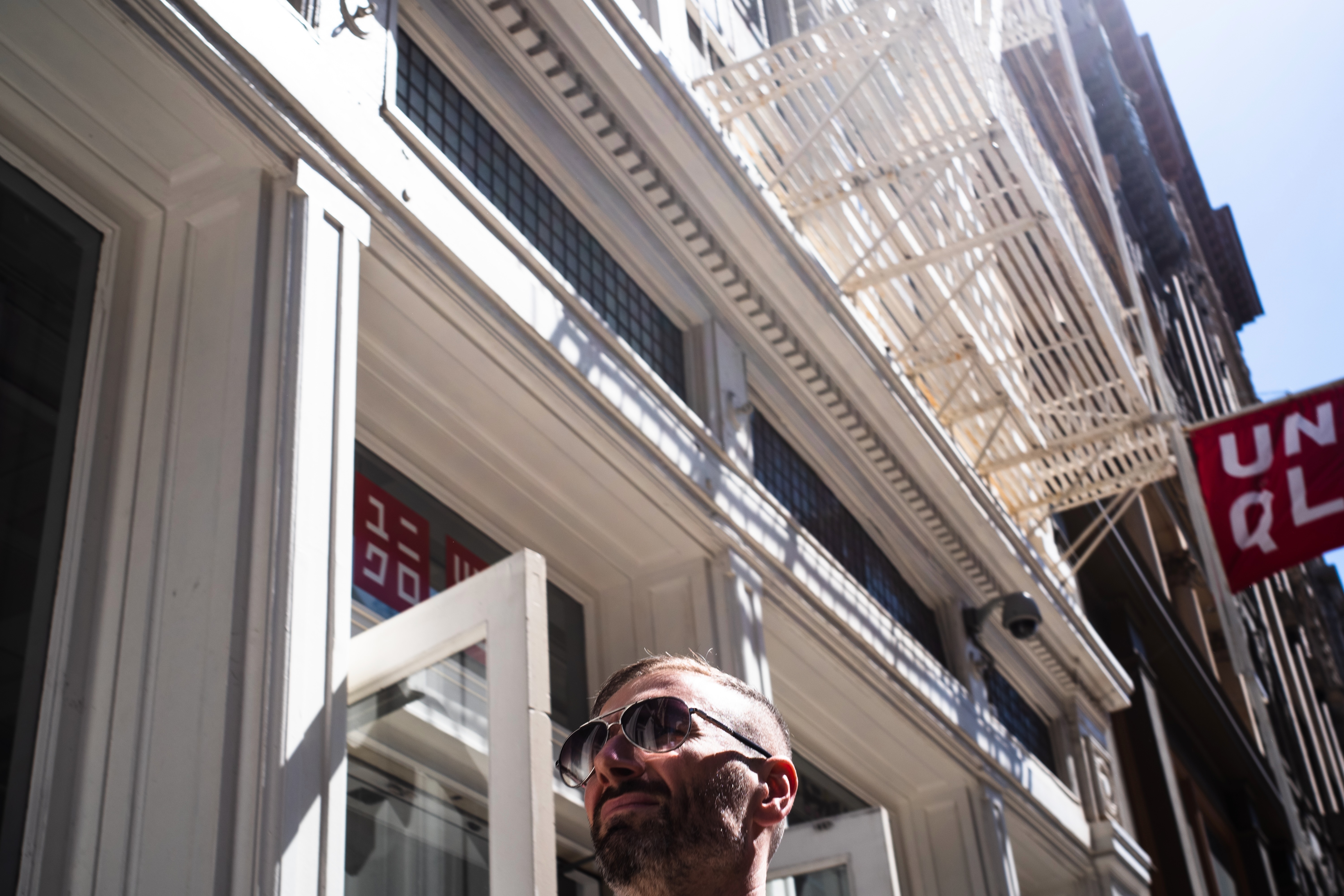 A man stands casually beneath a sunlit fire escape, exuding a relaxed, contemplative vibe. The bright, stark shadows cast by the midday light create a dynamic contrast with the muted tones of the building, framing his thoughtful expression and stylish sunglasses. The scene captures a fleeting moment of urban life, filled with warmth and quiet introspection.