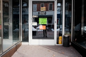 The photograph captures a storefront shrouded in melancholy, with bright signs declaring 'Everything on Sale!' starkly juxtaposed against the 'Closed' notice. Reflections in the glass hint at an empty street, emphasizing a sense of abandonment and missed opportunities. The soft, natural light casts gentle shadows, further enhancing the mood of a once-thriving space now in quiet stillness.
