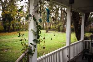This photograph captures a serene porch adorned with twirling vines, their leaves a mix of green and withered browns, hinting at the transition of seasons. A soft, diffused light bathes the scene, enhancing the tranquil mood, while the faint outlines of a lush green yard stretch into the background. The composition draws the eye along the rail, inviting contemplation and evoking a sense of nostalgic calm.