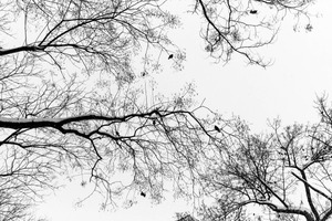This photograph captures the intricate silhouettes of bare branches against a pale sky, creating a stark yet serene composition. The absence of color accentuates the delicate details of the twigs and leaves, evoking a mood of quiet contemplation. The arrangement of the branches draws the eye upward, inviting thoughts of nature's stark beauty in a minimalist setting.