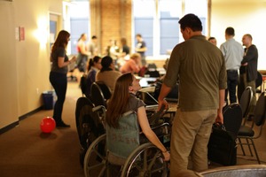 In a bustling communal space, a woman in a wheelchair engages warmly with a standing man, creating an intimate moment amid the lively atmosphere. Soft, natural light filters through large windows, enhancing the warmth of the interaction, while a vibrant red balloon adds a playful touch to the scene. The composition balances closeness and community, highlighting a sense of belonging and support among diverse individuals.