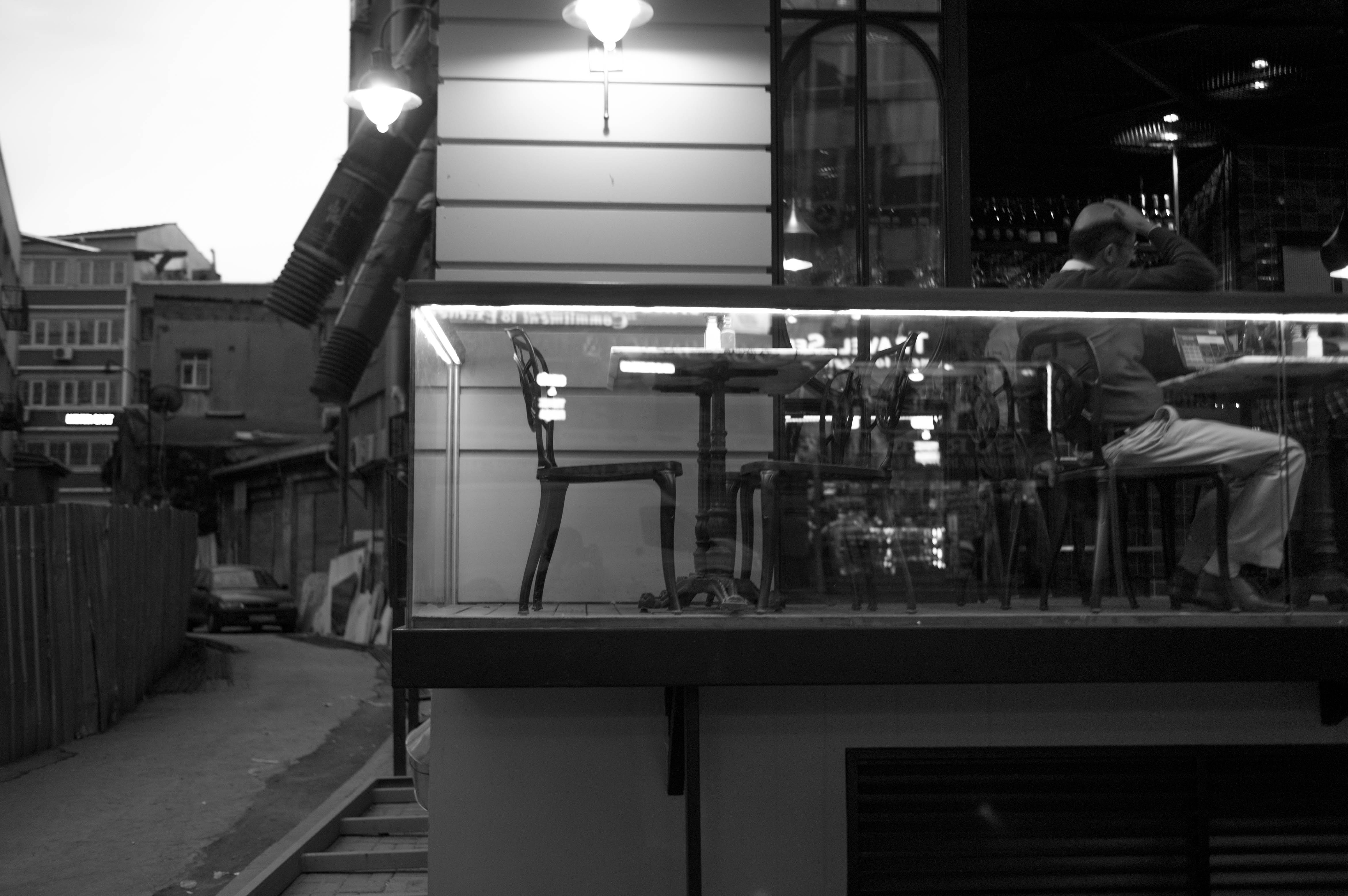 In a dimly lit café, the solitude of a lone figure seated at a table exudes a contemplative mood. The ambient glow of overhead lights reflects off the glass enclosure, creating a stark contrast against the urban backdrop. The composition draws the eye to the quiet interplay between light and shadow, evoking a sense of introspection in the bustling city.