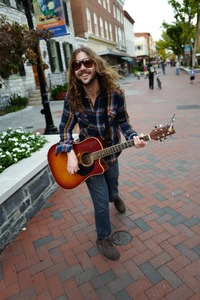 A joyful musician strums his guitar on a vibrant cobblestone street, exuding a carefree spirit. His long hair and stylish sunglasses complement the relaxed atmosphere, inviting passersby to join in the moment. The soft natural light enhances the warmth of the scene, creating a sense of community and musical harmony.