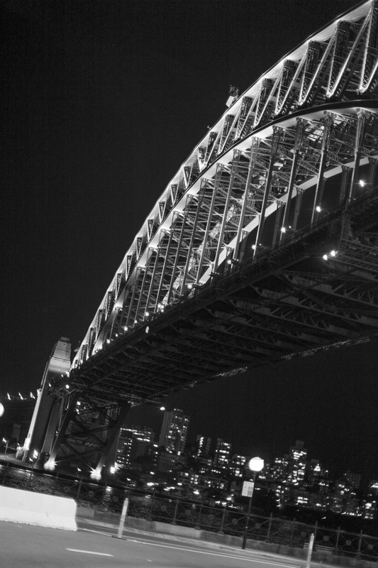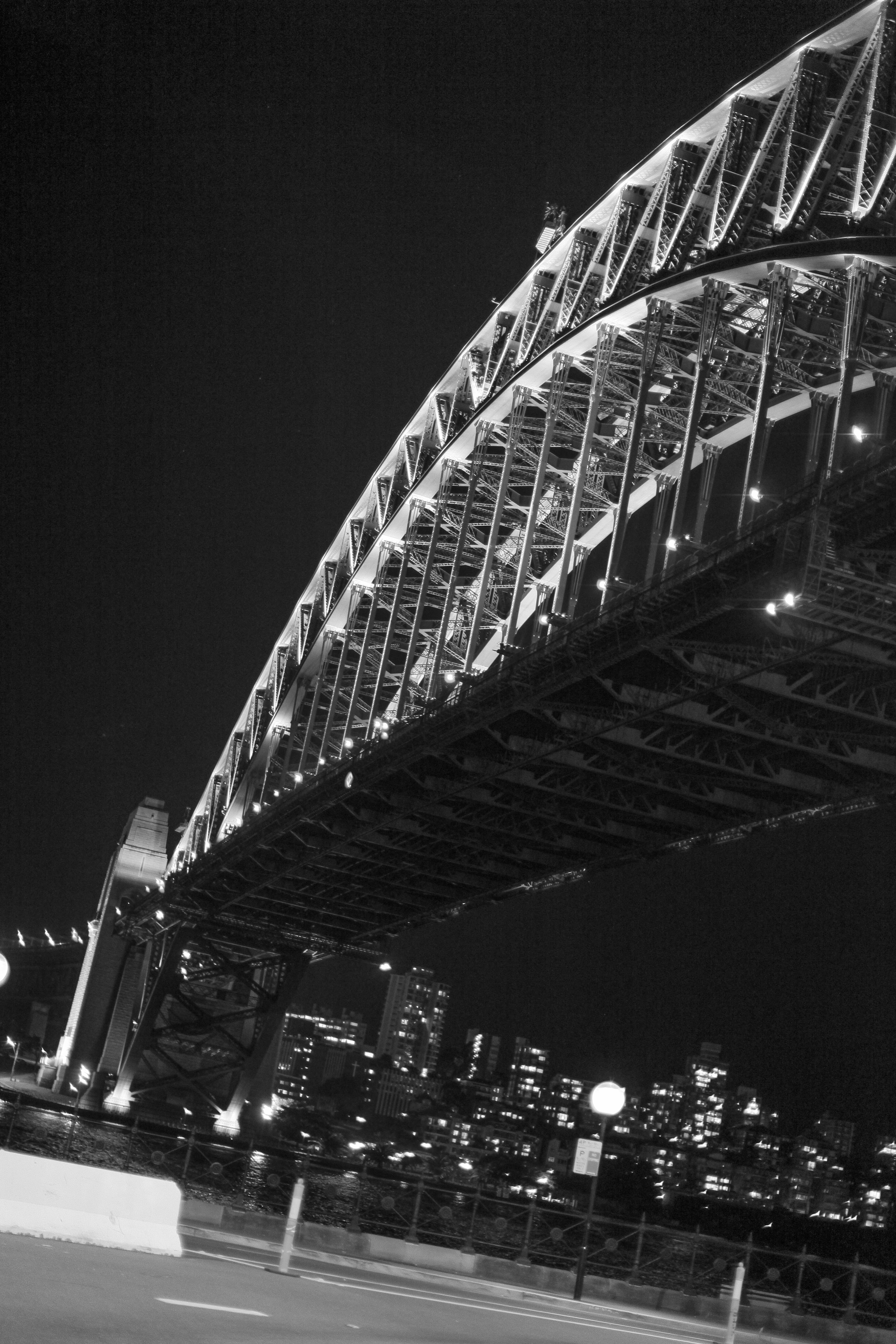 This photograph showcases a dramatic low-angle view of a monumental bridge at night, blending architectural grandeur with urban ambiance. The stark black and white tones amplify the intricate details of the structure while the city skyline glimmers gently in the background, creating a moody, contemplative atmosphere. The lighting highlights the bridge's steel framework, enhancing its imposing presence against the serene night sky.