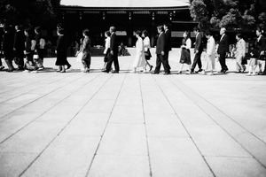 A procession of elegantly dressed individuals moves in unison across a paving stone courtyard, evoking a sense of ceremony and tradition. The black-and-white composition enhances the emotional weight, focusing attention on their dignified strides and the simple yet profound connection to cultural roots. Soft lighting casts gentle shadows, adding depth to the serene atmosphere of this significant moment.