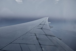 The photograph captures a close-up view of an aircraft's wing, stretching across the frame and cutting through a moody sky. Soft, muted tones evoke a sense of calm and solitude, while the hazy horizon hints at distant landscapes below. The overall composition invites the viewer to reflect on the journey taken, nestled in the quiet embrace of the clouds.