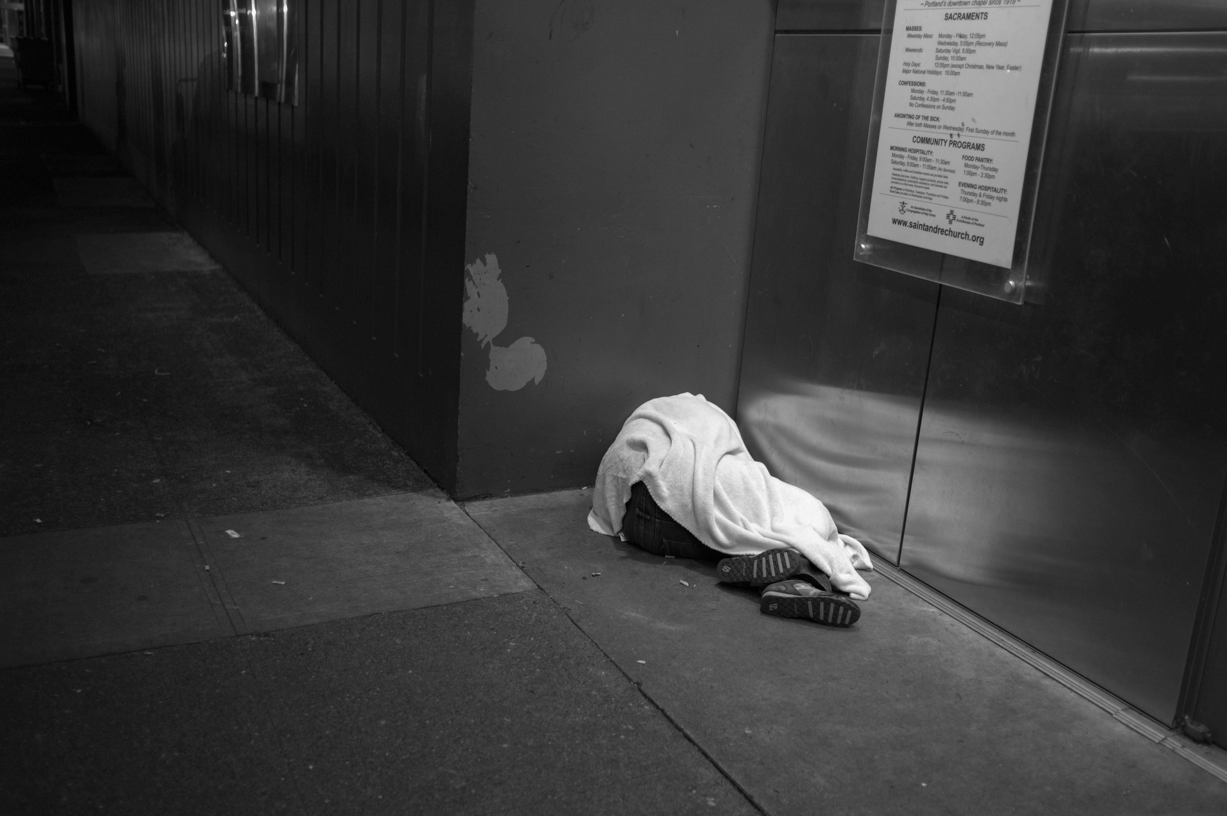 A solitary figure, wrapped in a white blanket, lies curled up against a wall in a shadowy corner, underscoring the stark reality of urban life. The black-and-white composition emphasizes the somber mood, with dim lighting casting a gentle glow that draws attention to their vulnerable state. The juxtaposition of the person against the sleek elevator and informational sign starkly highlights the contrast between two worlds existing side by side.