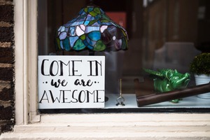 A charming window showcases a welcoming sign that reads 'Come in we are awesome', inviting passersby with its playful message. Above, a stained glass lamp casts a warm glow, complementing the vibrant green figurine of a frog nearby. The overall atmosphere is friendly and eclectic, enhanced by the rustic texture of the brick wall behind.