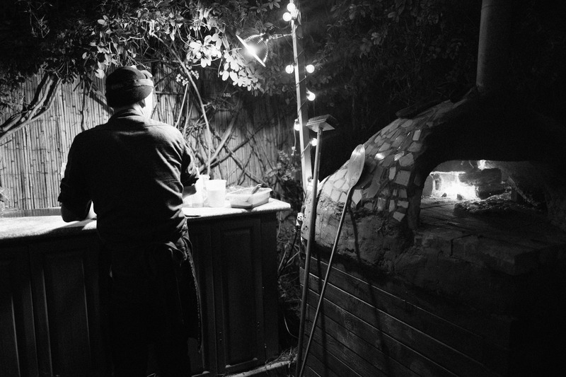 A solitary figure stands at a rustic outdoor kitchen, illuminated softly by the glow of string lights. The black-and-white palette enhances the moody atmosphere, emphasizing the warmth emanating from a nearby wood-fired oven, while the surrounding foliage creates an intimate, secluded setting. The scene evokes a sense of quiet contemplation and culinary passion under the night sky.