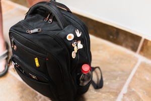 A close-up of a black backpack adorned with colorful pins, giving it a playful and personal touch. The backpack rests on a tiled floor, creating a contrast between its sleek design and the vibrant accessories. The lighting is warm and inviting, highlighting the details of the pins and the texture of the bag.