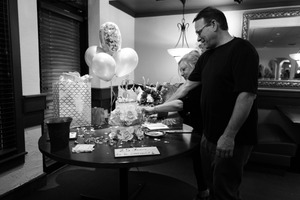 In a warmly lit restaurant setting, a couple joyfully prepares to cut a decorated cake surrounded by gifts and festive balloons. The black-and-white composition adds a timeless quality, capturing a moment of celebration and affection. A sense of nostalgia and camaraderie permeates the scene as they commemorate a significant milestone together.