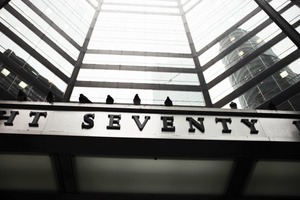 In this photograph, a line of pigeons perches atop a metallic sign, creating a sense of stillness amid the urban bustle. The composition beautifully captures the interplay of lines from the towering architecture above and the minimalist lettering below, inviting the viewer's eye to traverse the scene. The muted lighting and cloudy atmosphere evoke a tranquil yet somber mood, hinting at the quiet moments hidden within a vibrant city.