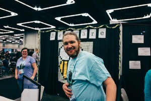 A cheerful man in a light blue t-shirt stands at a booth, exuding warmth and friendliness. The backdrop features a playful 'Beware' sign, adding an element of fun to the bustling convention atmosphere filled with attendees. Soft, ambient lighting enhances the engaging and lively mood of the scene, inviting conversation and connection.