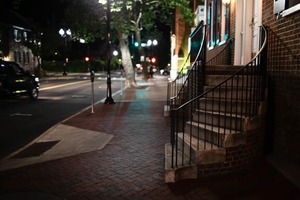 A softly lit urban street scene at night conveys a sense of quiet solitude. The curved staircase, illuminated subtly, draws the eye upward, while warm streetlights cast gentle shadows on the brick pavement. The composition captures the juxtaposition of architectural lines and the empty street, evoking an atmosphere of introspection and calm.