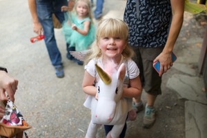 In this lively scene, a young girl beams with delight as she holds a plush unicorn, embodying the magic of childhood. The soft focus on her joyful expression contrasts with the vibrant, bustling background, creating a sense of warmth and happiness. Natural light bathes the moment, enhancing the carefree atmosphere of a playful day.