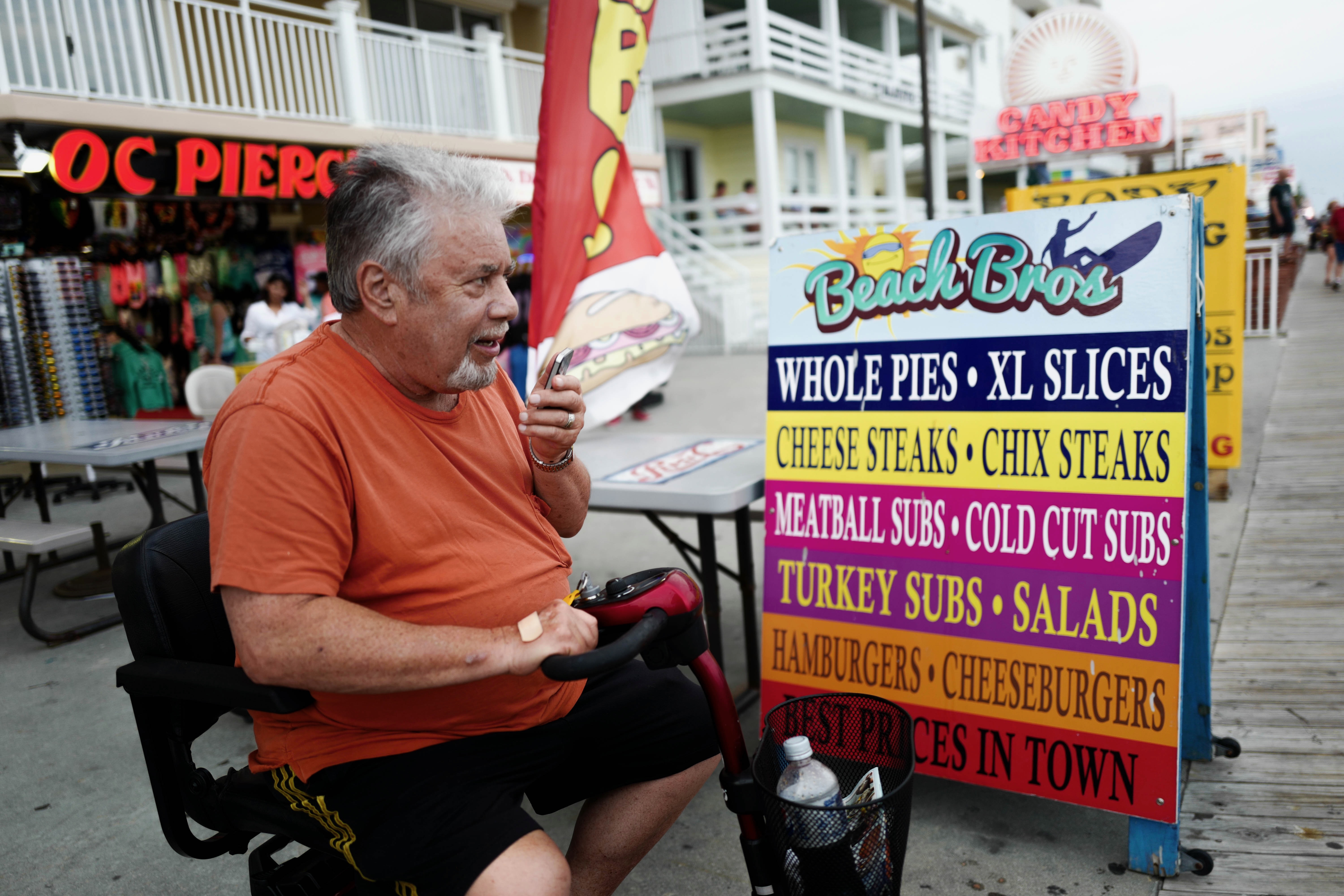 A contemplative older man sits in a mobility scooter, gazing at a vibrant food menu adorned with playful colors. The scene captures a lively seaside atmosphere, with bright signage contrasting against subdued, cloudy skies, evoking a sense of nostalgia and summer leisure. Soft lighting casts gentle shadows, enhancing the relaxed mood of this beach setting.