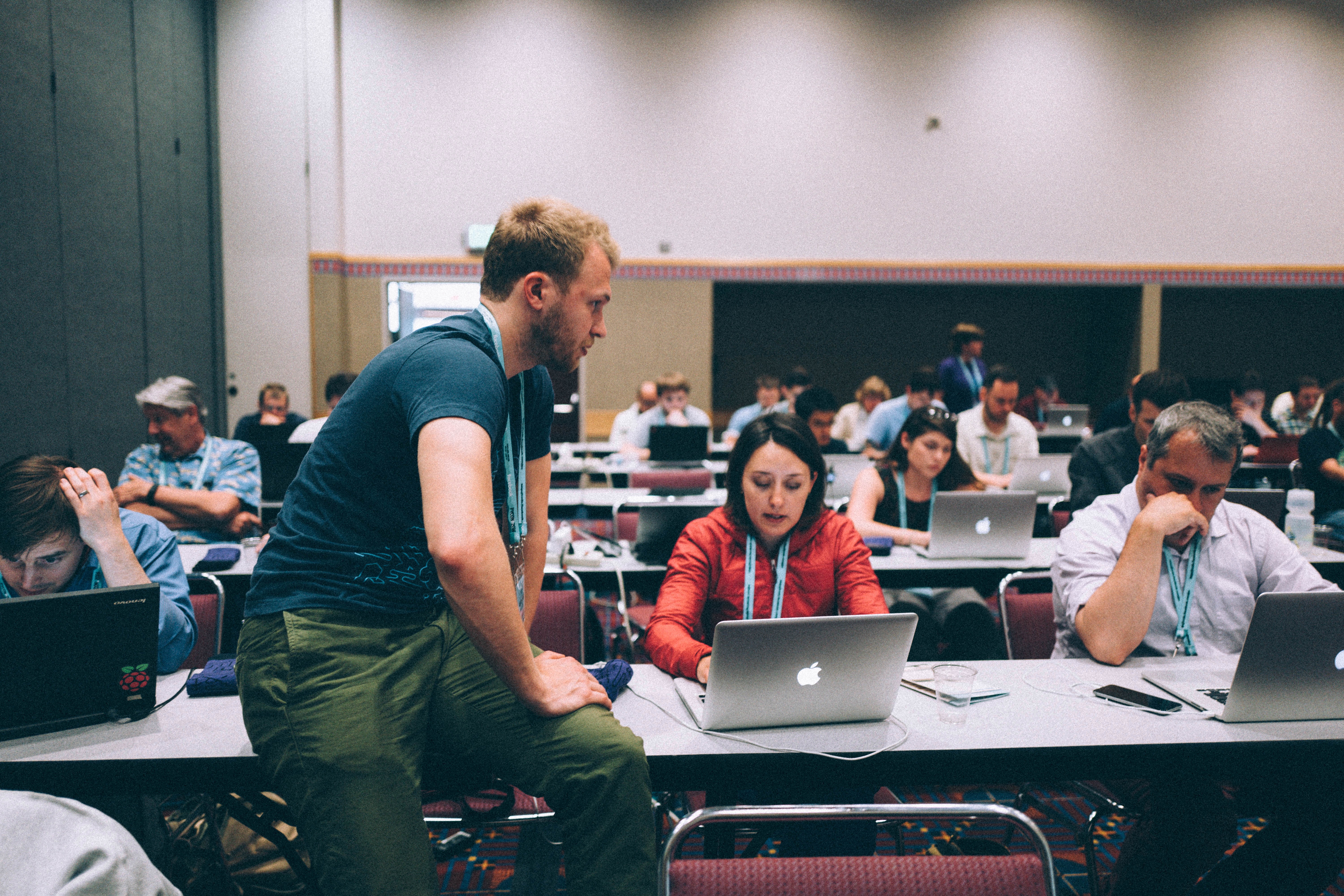 The photograph captures a collaborative moment in a bustling conference room filled with focused individuals absorbed in their laptops. The warm lighting enhances the atmosphere, highlighting the engaged expressions of the subjects as they navigate a sea of technology and ideas. A central figure leans in thoughtfully, fostering a sense of connection amid the collective creativity and concentration of the group.