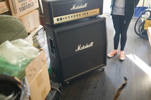 A Marshall amplifier stands boldly amidst an assortment of cluttered boxes and belongings, hinting at a vibrant musical spirit trapped in a cozy, chaotic space. The warm, natural light spills into the room, creating a nostalgic atmosphere while highlighting a figure in playful orange sneakers, embodying both youth and creativity. This juxtaposition of the powerful amplifier and the disordered environment evokes a sense of anticipation, as if music is just waiting to break free.