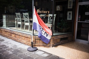 A vibrant 'OPEN' flag stands proudly outside Patton's furniture store, signaling warmth and welcome. The soft, diffused light enhances the inviting atmosphere, highlighting the charming window display filled with elegant furnishings. The wet pavement reflects the scene, adding a touch of depth and serenity to the urban setting.