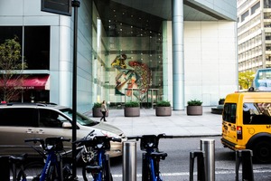This photograph captures a dynamic urban scene where a woman walks past a vibrant mural adorning the glass facade of a modern building. The interplay of light and shadow creates a sense of depth, while the parked bikes in the foreground add a layer of everyday life to the composition. The mood is both bustling and contemplative, reflecting the juxtaposition of art and architecture in the city.