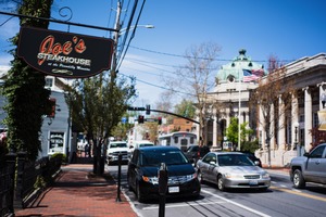 The photograph captures a bustling street scene featuring Joe's Steakhouse prominently framed by its bold sign. Sunlight bathes the scene, highlighting the vibrant mood as cars navigate through the busy thoroughfare, with historical architecture and lush greenery softly contrasting the urban environment. The clear blue sky adds an uplifting atmosphere to the lively streetscape.