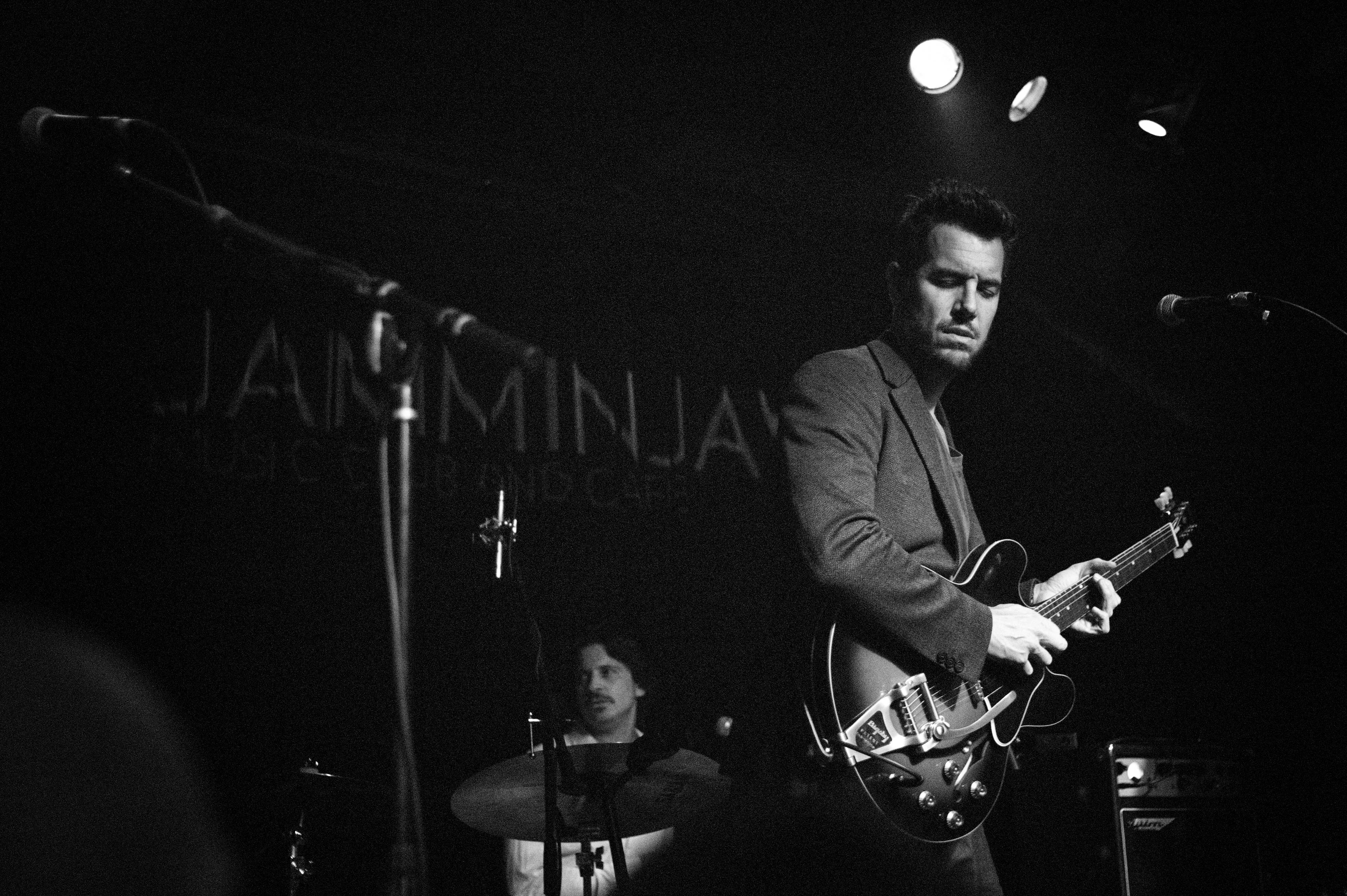 A captivating scene of a musician deeply immersed in his performance, exuding both intensity and vulnerability. The dramatic black-and-white composition enhances the atmosphere, with soft lighting casting shadows that create a moody, intimate vibe. In the background, a drummer adds depth, subtly anchoring the moment in a live music setting.