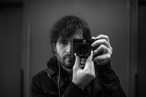 In this striking black-and-white photograph, a man holds a vintage camera to his face, embodying the essence of introspection and creativity. The soft, subdued lighting casts gentle shadows, enhancing the mood of contemplative solitude. His tousled hair and casual attire suggest an artistic spirit, framed by a minimalist backdrop that keeps the focus on his thoughtful expression and the act of capturing moments.
