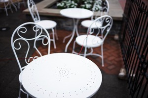 The photograph captures a charming outdoor café scene, featuring white wrought iron tables and chairs that suggest a sense of elegance and calm. Soft, diffused lighting enhances the ethereal mood, while the inviting arrangement prompts thoughts of leisurely conversations and warm afternoons. The slight blur and focus on the central table create a sense of intimacy, emphasizing the solitude awaiting its guests.