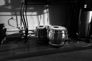 Two traditional tabla drums rest on a wooden floor, their intricate surfaces catching soft, diffused light. Shadows stretch across the scene, creating a contemplative mood that invites the viewer to pause and reflect on the music they might produce. The simple composition, framed by the surrounding darkness, emphasizes the drums' artistry and the intimacy of the space.