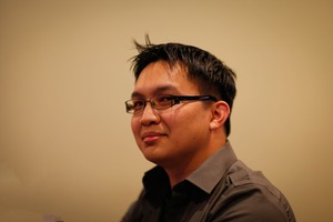 The subject, a young man, sits in profile against a softly blurred, neutral background, exuding a quiet confidence. The warm, diffused lighting highlights his features and the sleek contours of his frame, creating an intimate and inviting mood. His slight smile hints at a story untold, inviting viewers to ponder his thoughts and experiences.
