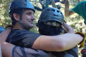 In a candid moment, two individuals share a warm embrace, clad in helmets that hint at an exhilarating outdoor escapade. The sunny atmosphere, dappled with gentle shadows from surrounding trees, conveys a sense of camaraderie and anticipation. This image captures the exciting blend of thrill and friendship that defines their adventurous spirits.