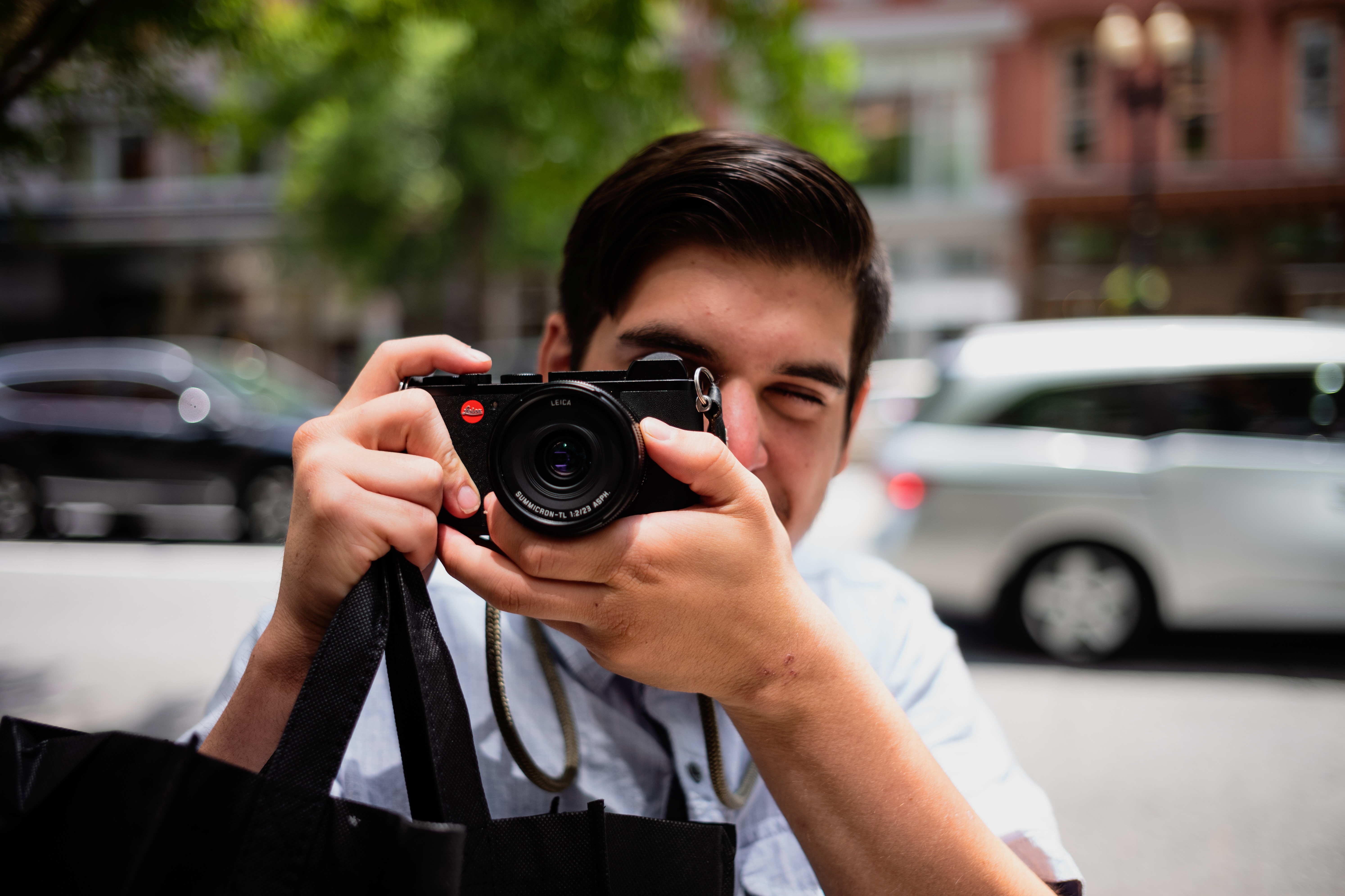 The photograph features a young man holding a camera, playfully aiming it at the viewer. Sunlight filters through the trees, casting a warm glow that enhances his cheerful expression. The blurred city background adds an urban context, while the focus remains on his engaging smile and the camera, symbolizing a shared moment in photography.
