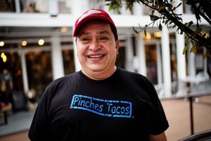 A cheerful man stands smiling in front of a vibrant backdrop, dressed in a black shirt that proudly displays the name of his taco venture. The warm lighting and soft focus create an inviting atmosphere, enhancing the mood of friendliness and pride in his craft. Subtle greenery frames the scene, adding a touch of life to this lively moment.