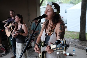 In this vibrant scene, a band performs under soft, ambient lighting, creating a warm and inviting atmosphere. The lead singer, adorned with a floral crown and deeply focused, strums her guitar passionately, while her bandmates harmonize alongside her. The relaxed setting suggests a close-knit community, immersed in the joy of music.